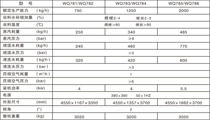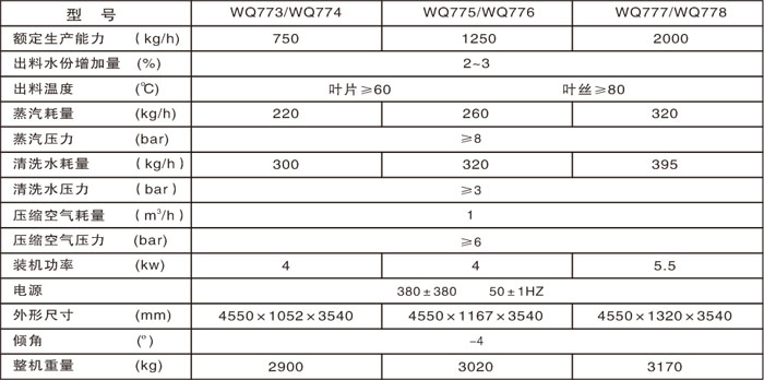 隧道式煙梗/梗絲回潮機(jī)主要技術(shù)參數(shù)